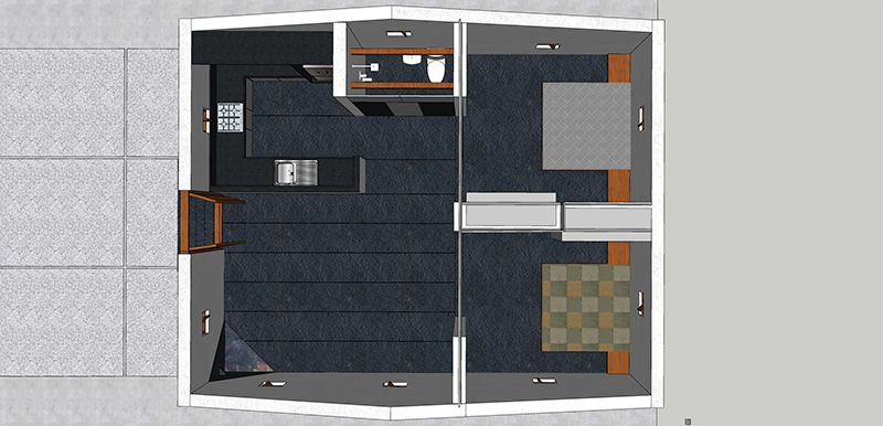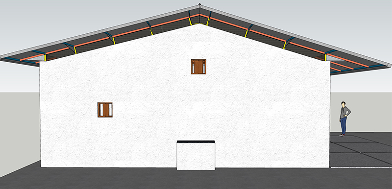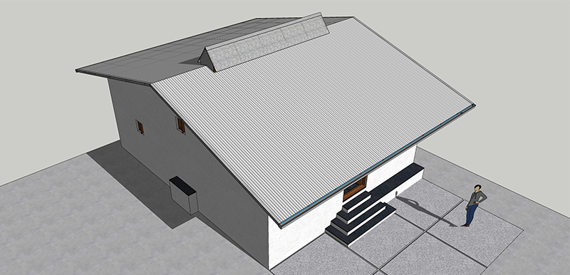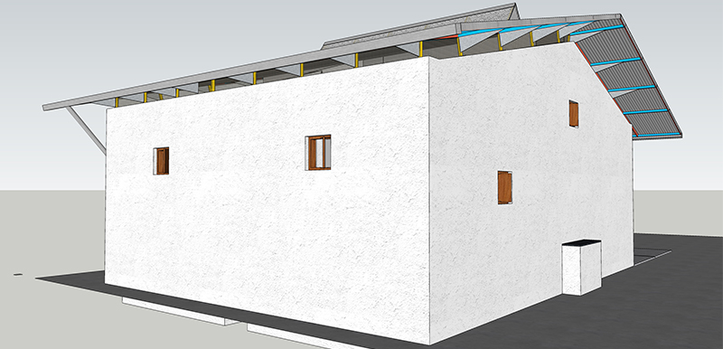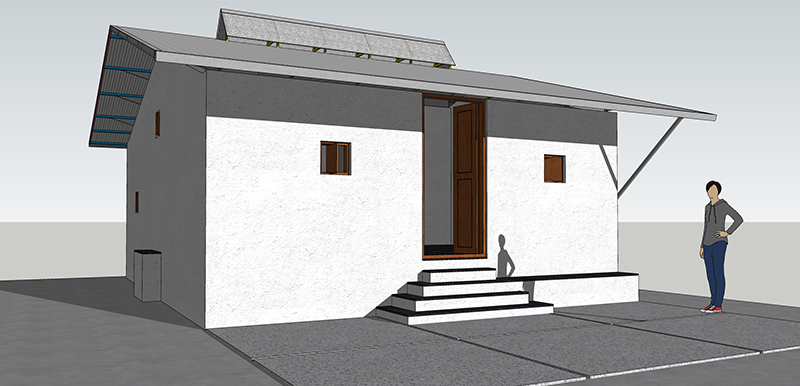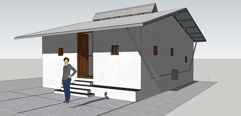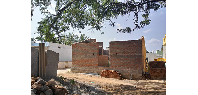 The small house of 800sq.ft at Pavagada, Karnataka is worked on the principles to help the house to retain the high average temperature of 40*C. The house has rainwater harvesting tanks below the bedrooms to keep the temperature less. The roof is worked out with Rockwool panel insulation under the corrugated sheet roofing. The rat trap walls all around with local materials for flooring help to keep the house sustainable.